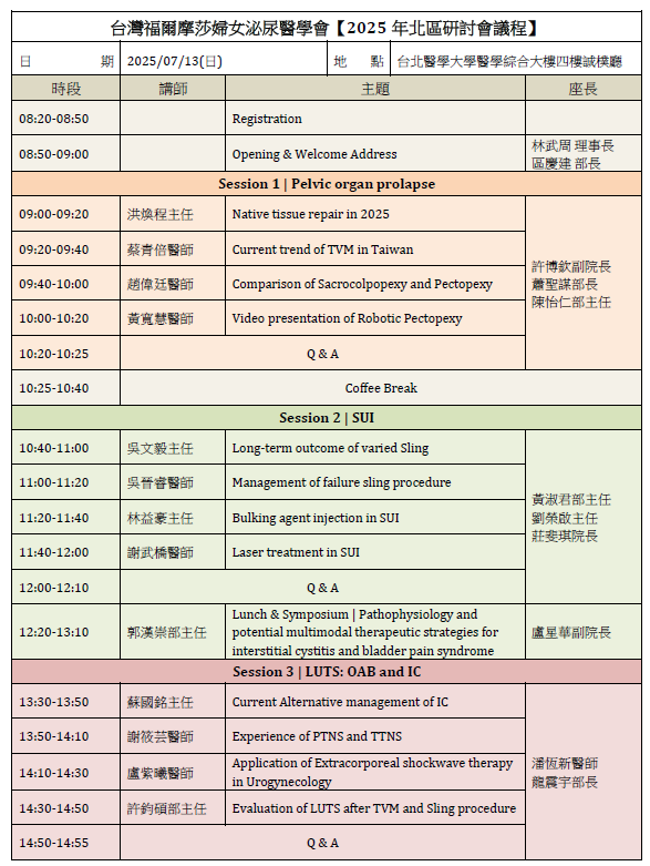 本會謹訂於2025年7月13日 假台北醫學大學綜合大樓四樓誠樸廳 舉行【2025年北區研討會】,學會廣邀各界婦女泌尿專科權威蒞臨演講。