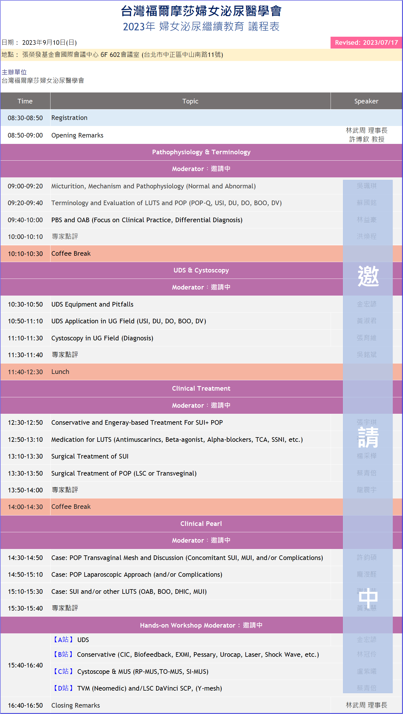 台灣福爾摩莎婦女泌尿醫學會謹訂於2023年9月10日 假 張榮發國際會議中心 602會議室(台北市中正區中山南路11號)舉行『 2023年婦女泌尿繼續教育 』。台灣福爾摩莎婦女泌尿醫學會提供最實用、最即時的婦女泌尿專業知識,期待您的熱情參與,建立讓台灣婦女泌尿同好們進行學術交流、臨床實務與發展研究的開放平台。