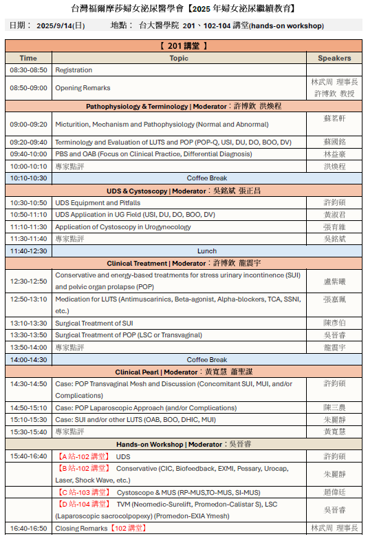 台灣福爾摩莎婦女泌尿醫學會謹訂於2025年9月14日(日) 假 台大醫學院 201、102-104講堂 (台北市中正區仁愛路一段1號)舉行『 2025年婦女泌尿繼續教育 』。